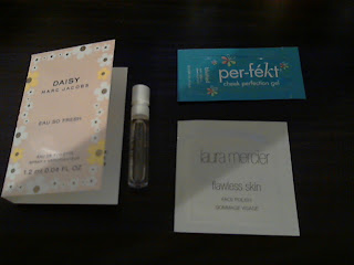 I picked a perfume, Daisy by Marc Jacobs (Eau So Fresh). It is a very floral scent which I'm not usually too crazy about but I do like this one. The sample bottle comes with a spray top so that's cool. I also picked a Laura Mercier Flawless Skin Face Polish and a per-fekt Cheek Perfection Gel which sounds interesting. They were also having a special sample deal so I put in the code and got this.